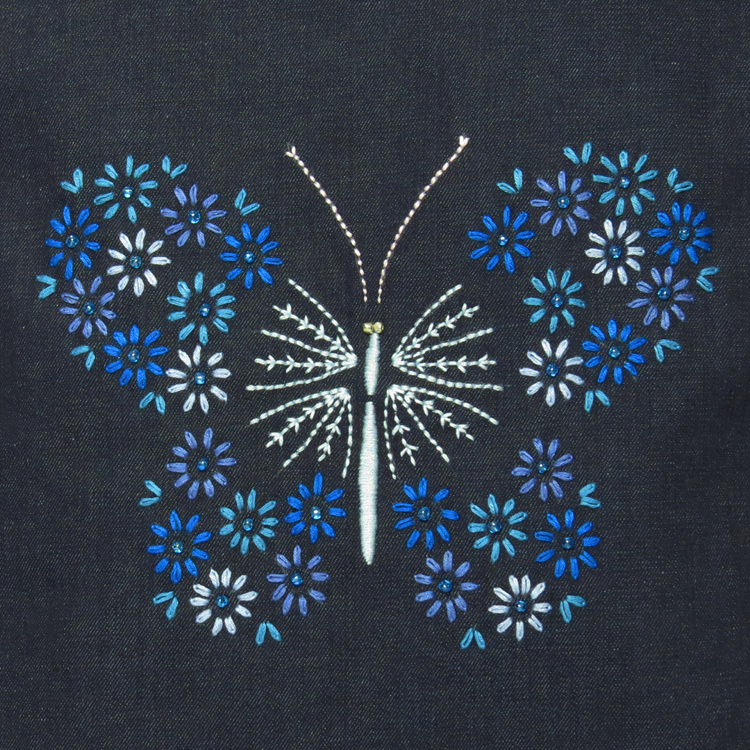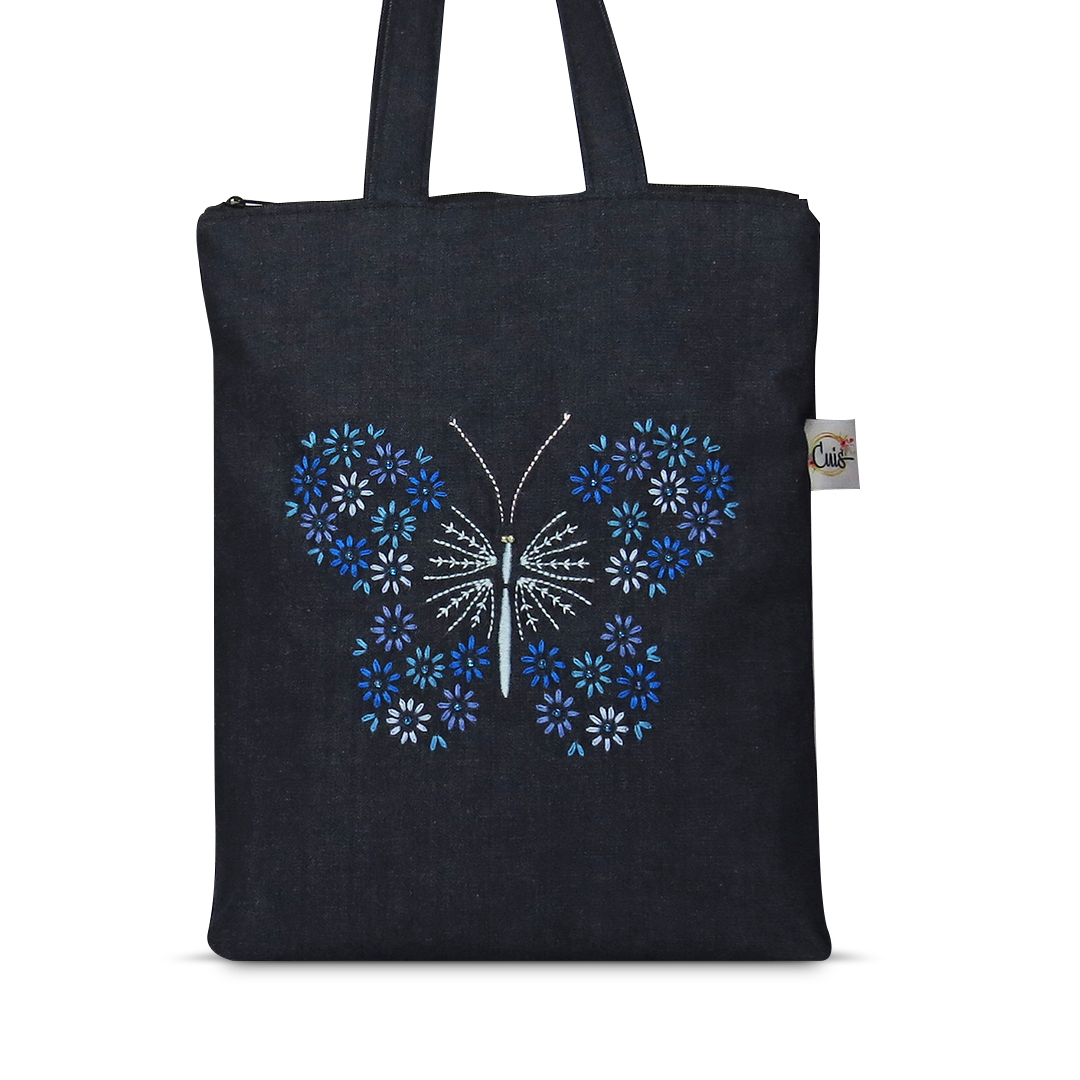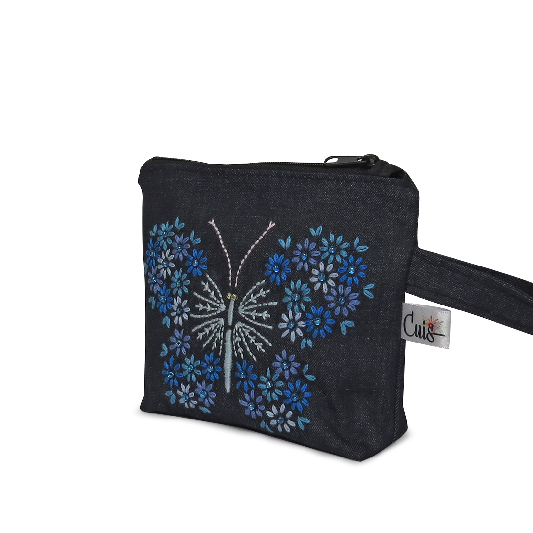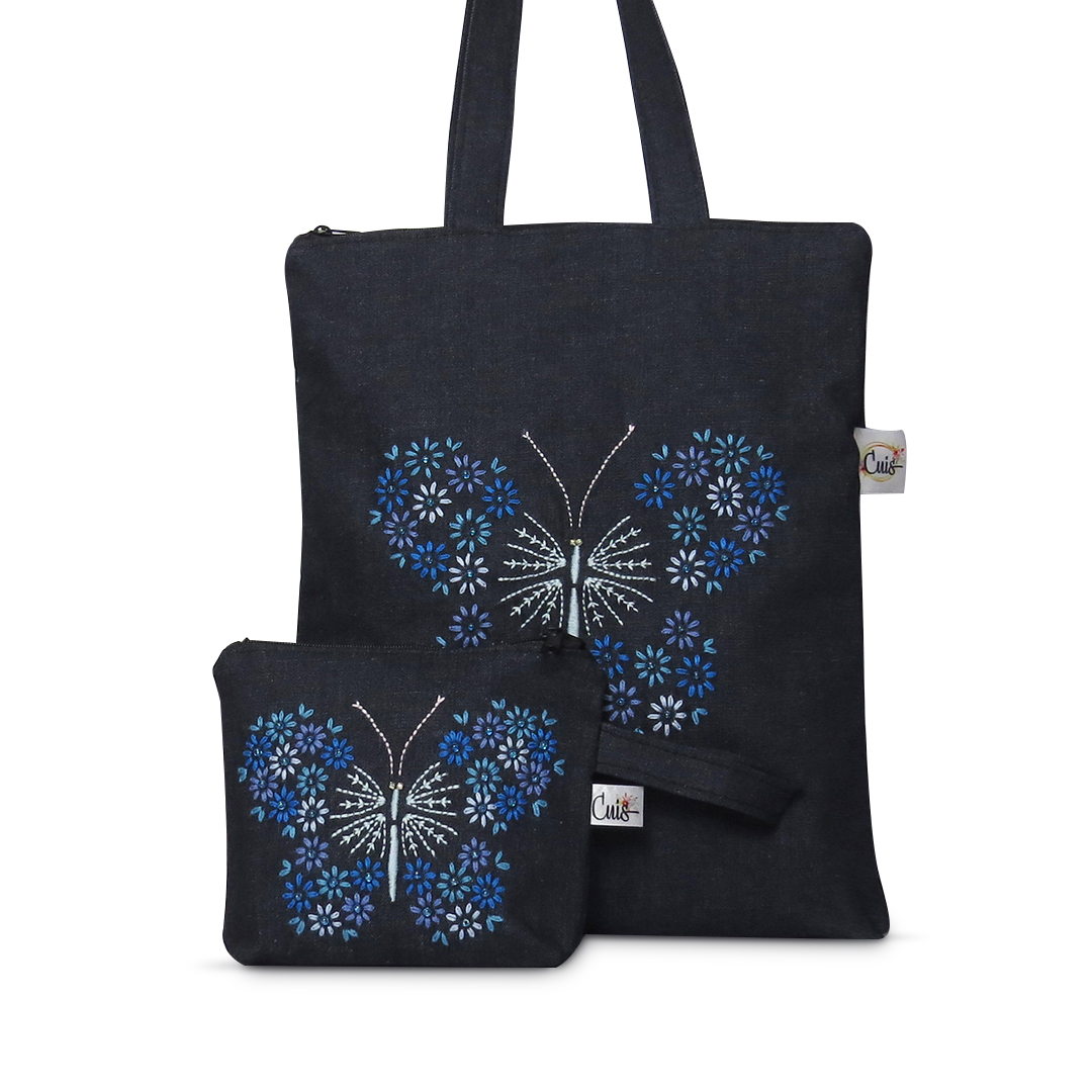 Bolsa y Estuche de mezclilla Bordada Mariposa azul