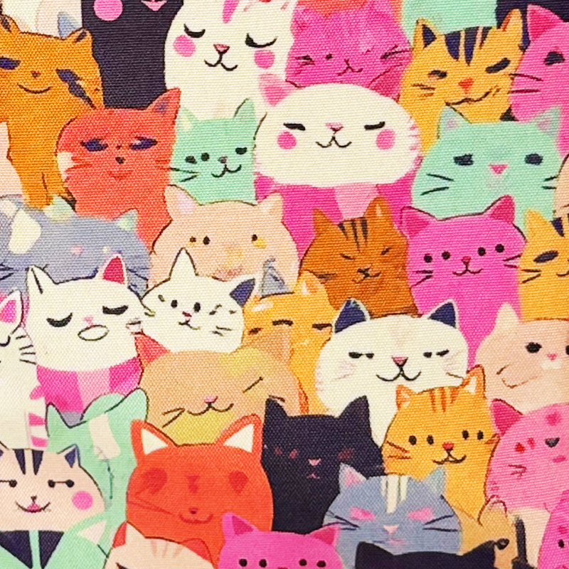 Totebag Gato Colors – Estampado multicolor de gatitos, tela impermeable, dos bolsillos delanteros, asas reforzadas y cierre seguro. Hecha en Chile. ¡Tu look más felino y divertido!